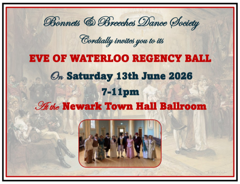 To celebrate the incredible 250th anniversary of the Newark Town Hall , Bonnets and Breeches Dance Society are thrilled to announce that we will be hosting our very first ball! As the date also coincides with the build up to the Battle of Waterloo we have decided to theme it around the battle and call it 'The Eve of Waterloo Ball'.